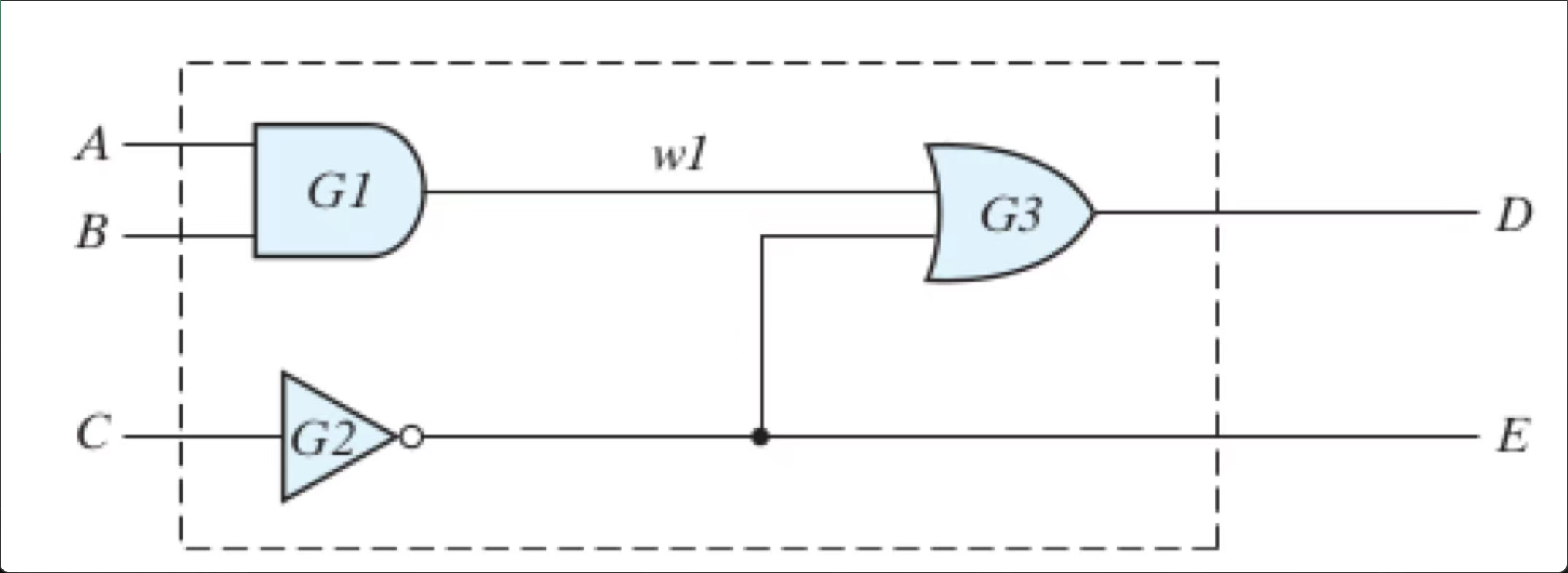 module simple_circuit (A,B,C,D,E);output D,E;input A,B,C;wire w1;// 规定了 output,input,wire分别是什么,ABC是输入,DE是输出,还有w1是一条线and G1(w1,A,B);not G2(E,C);or G3(D,w1,E);
