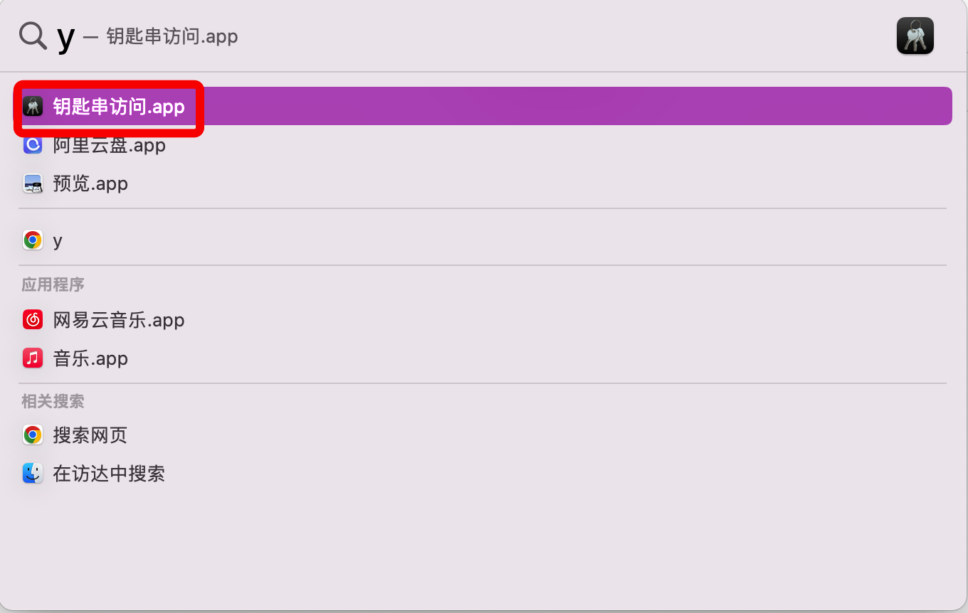 。屏幕右上角会出现搜索框。输入 “钥匙串访问” 或拼音首字母 “YSJFW”。在结果中,按回车键即可打开。