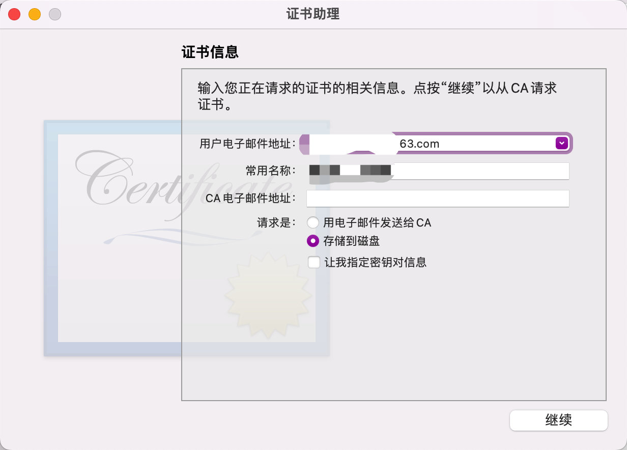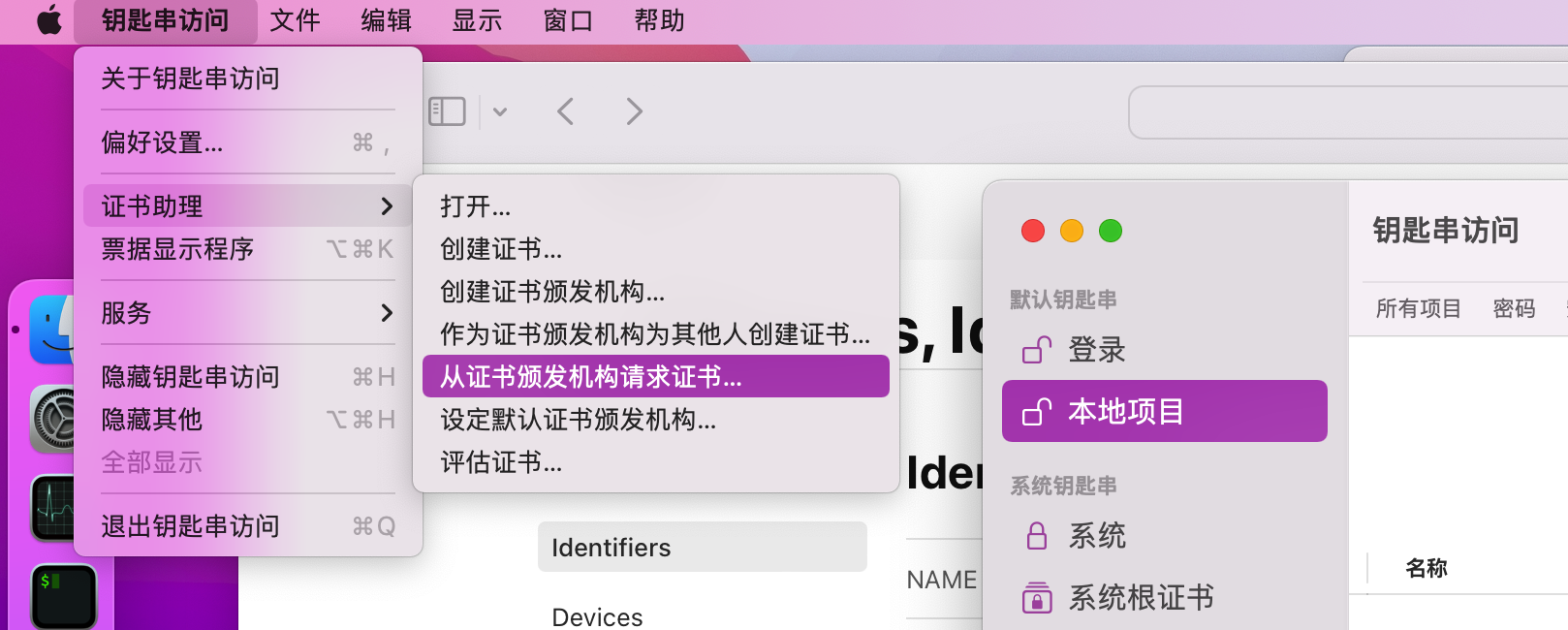 在顶部菜单栏,选择 “钥匙串访问” -> “证书助理” -> “从证书颁发机构请求证书…”在弹出的窗口中:用户电子邮件地址:填写你的开发者账号邮箱。常用名称:填写你的姓名或公司名。CA 电子邮件地址:留空。选择:“存储到磁盘”。点击 “继续”,将文件保存到你的电脑上。