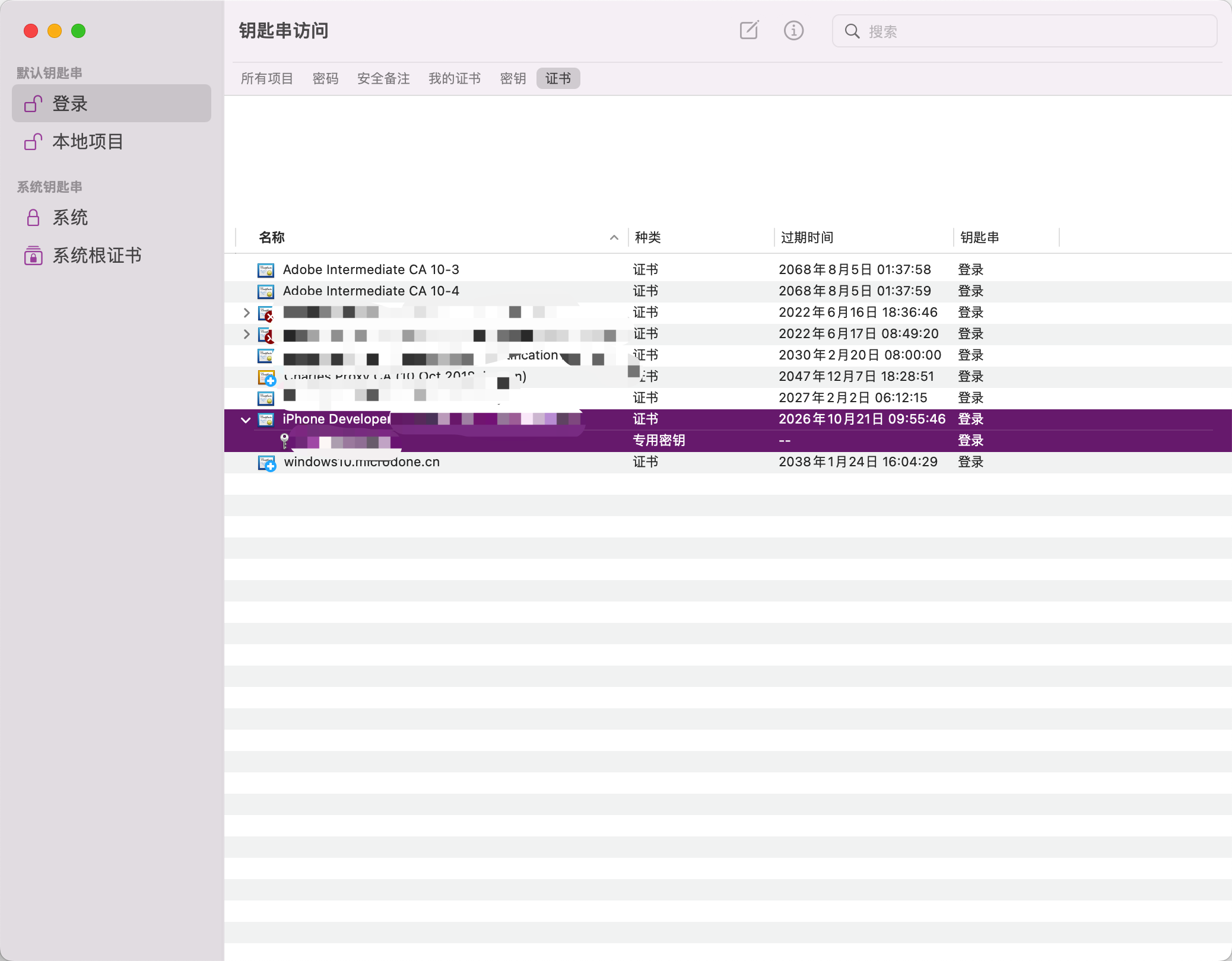 在钥匙串列表中选择"登录",然后在种类一栏选择"我的证书"。找到你刚刚安装的证书,名字以iPhone Developer开头