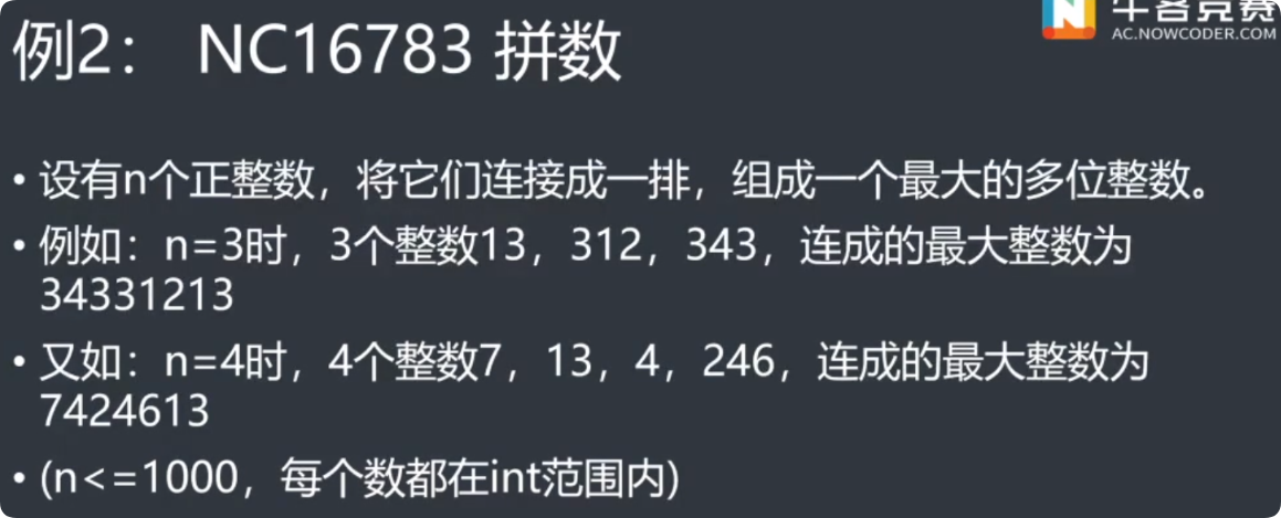 思路:这个题最先想到的思路就是用字典序比较,然后直接拼接,但是当两个字符串的长度不相同的时候我们应该怎么进行比较呢?(解题的关键)