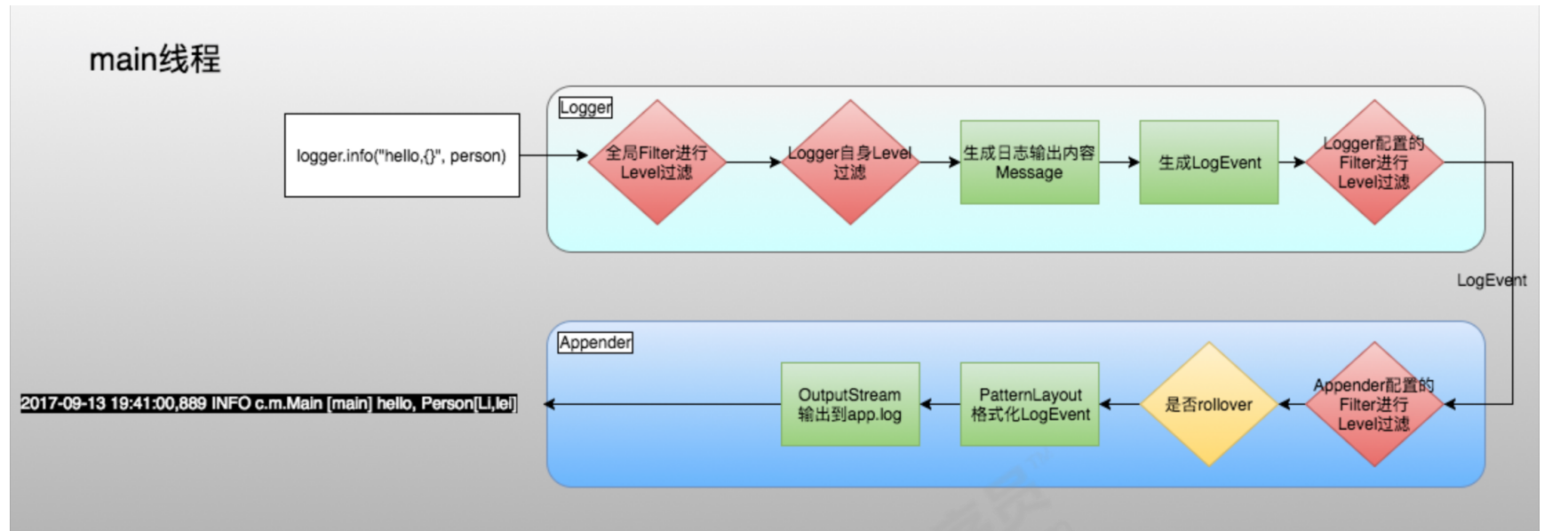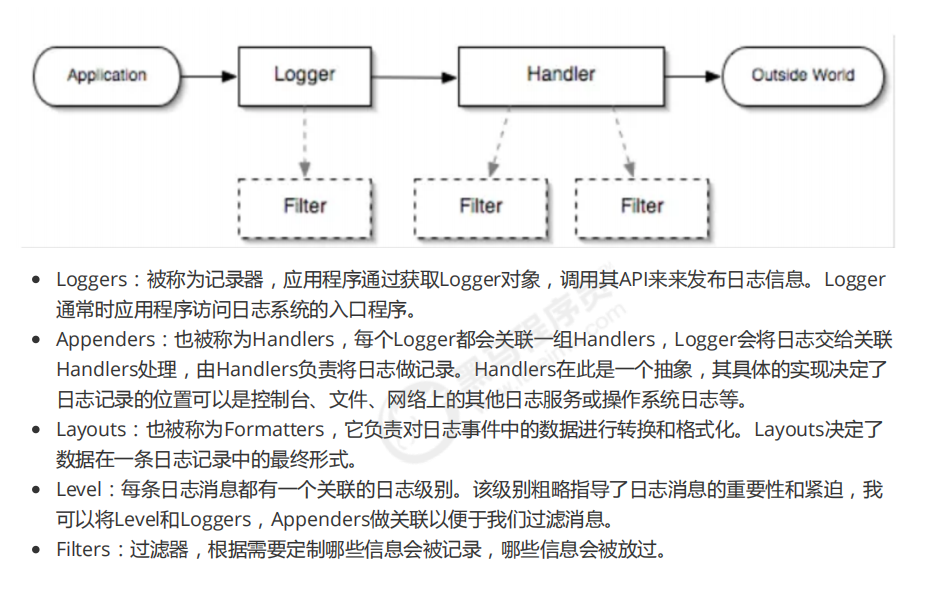 用户使用Logger来进行日志记录,Logger持有若干个Handler,日志的输出操作是由Handler完成的。在Handler在输出日志前,会经过Filter的过滤,判断哪些日志级别过滤放行哪些拦截,Handler会将日志内容输出到指定位置(日志文件、控制台等)。Handler在输出日志时会使用Layout,将输出内容进行排版。