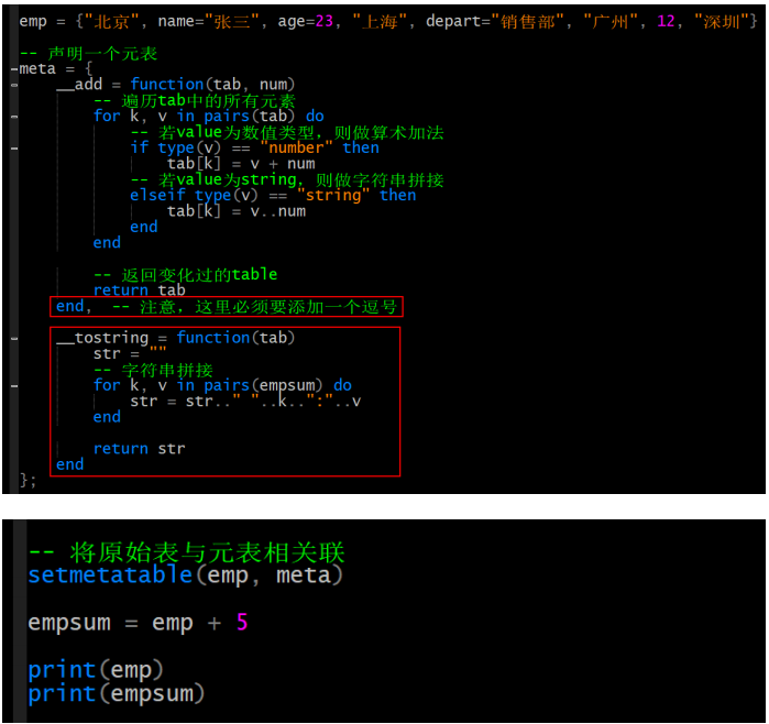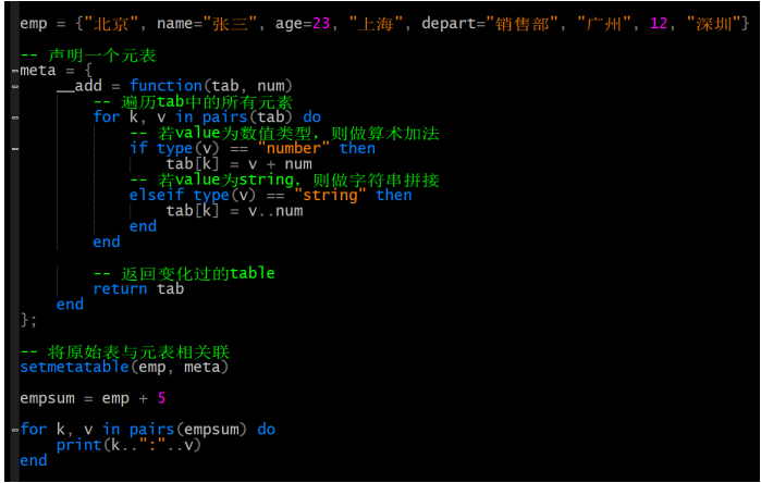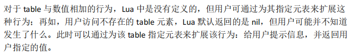 例如,如果要为一个 table 扩展加号(+)运算功能,则可重写该 table 元表的_ _add 元方法,而具体的运算规则,则是定义在该重写的元方法中的。这样,当一个 table 在进行加法(+)运算时,就会自动调用其元表的_ _add 元方法。