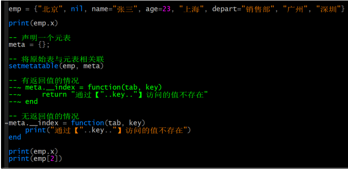 当用户在对 table 进行读取访问时,如果访问的数组索引或 key 不存在,那么系统就会自动调用元表的_ _index 元方法。
