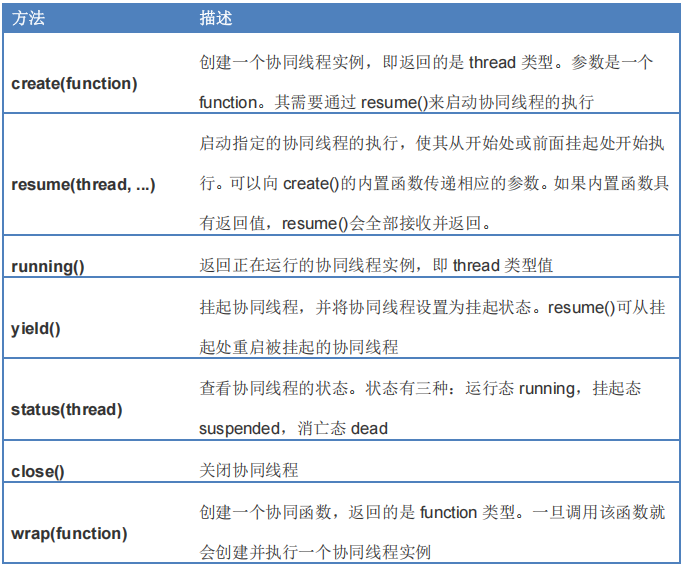 协同线程的类型为 thread,其启动、暂停、重启等,都需要通过函数来控制。下表是用于控制协同线程的基本方法。