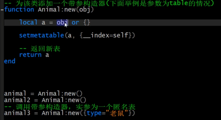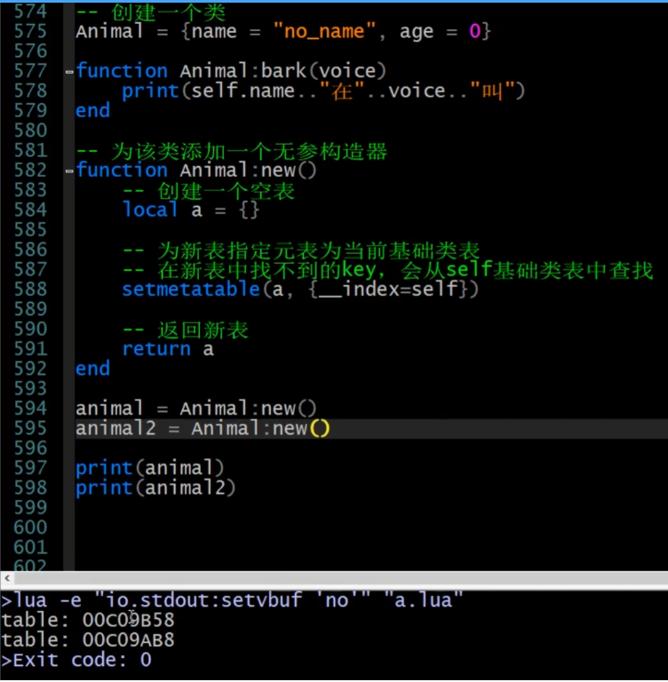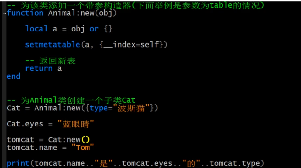 该元表重写_ _index 元方法,且将基础表指定为重写的_ _index 元方法。由于 new() 中的表是空表,所以用户访问的所有 key 都会从基础类(表)中查找。