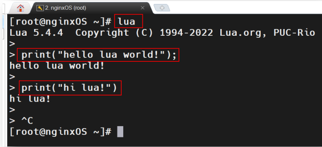 在任意目录下使用lua命令进入lua命令行模式,在其中输入语句后回车即可运行显示出结果,使用ctrl+C退出模式;lua对语句后的分号要求不是强制性的,有没有都行;