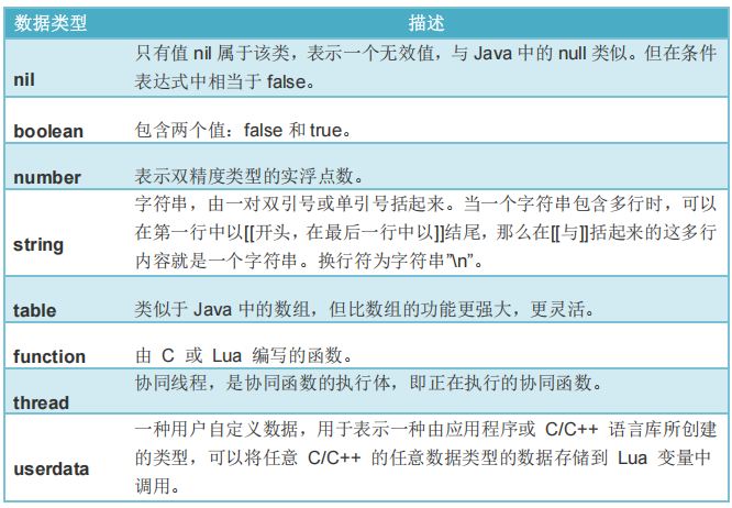 Lua 中有 8 种类型,分别为:nil、boolean、number、string、userdata、function、thread 和 table。通过 type()函数可以查看一个数据的类型,例如,type(nil)的结果为 nil,type(123)的结果为 number。