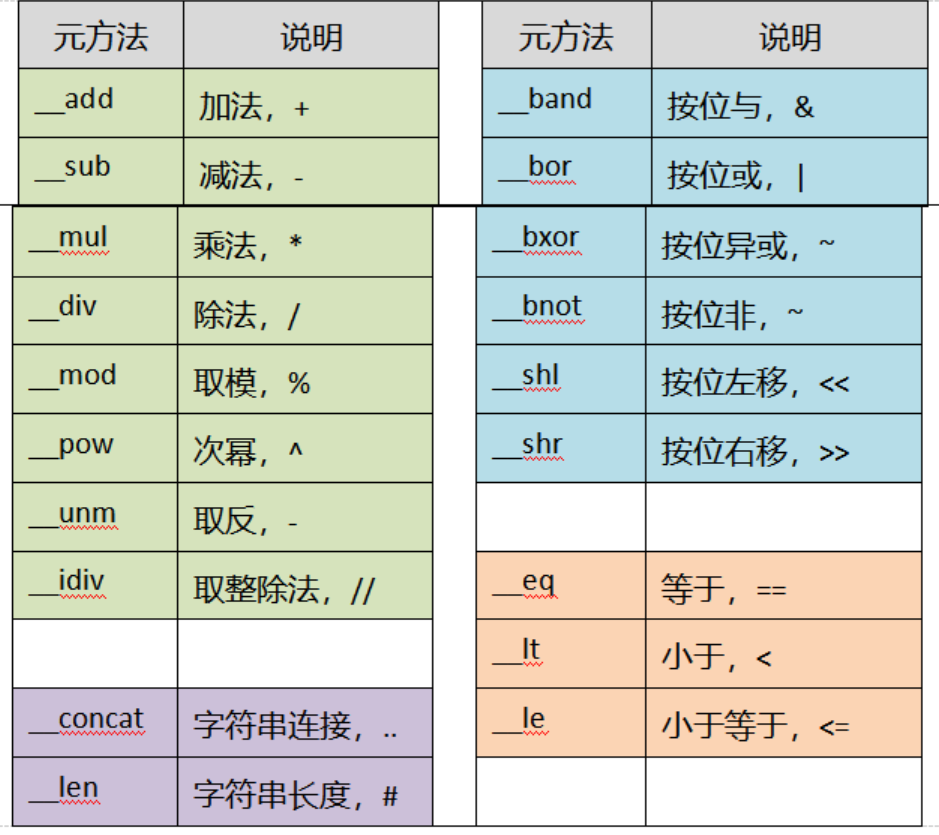 如果要为一个表扩展加号(+)、减号(-)、等于(==)、小于(<)等运算功能,则可重写相应的元方法。
