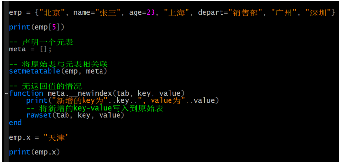 当用户为 table 中一个不存在的索引或 key 赋值时,就会自动调用元表的_ _newindex 元方法。该重写的方法可以是一个函数,也可以是另一个表。如果重写的_ _newindex 元方法是函数,且有返回值,则直接返回;如果没有返回值,则返回 nil。