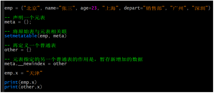 天津# emp.x = "天津"触发元表的__newindex,数据存入other表,故print(other.x)输出天津