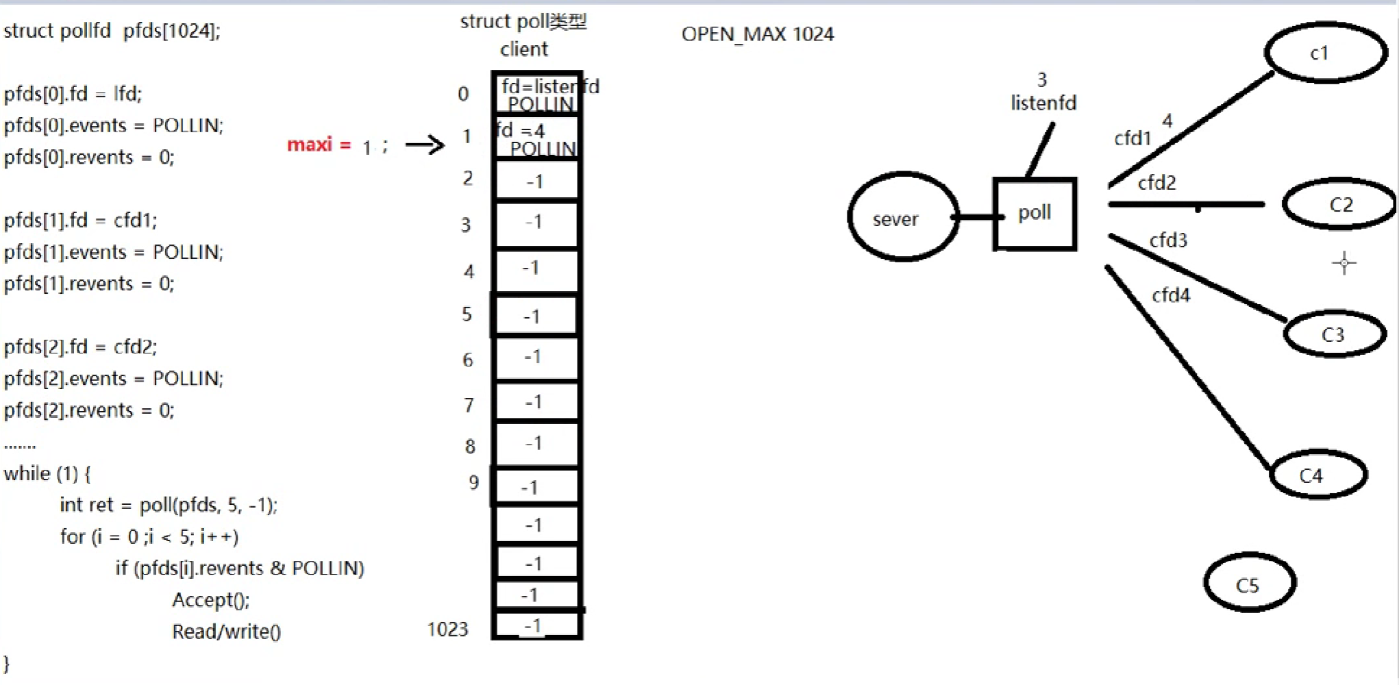 #define OPEN_MAX 1024int main(int argc, char* argv[]) {int i, j, maxi, listenfd, connfd, sockfd;int nready; /*接收poll返回值,记录满足监听事件的fd个数*/ssize_t n;char_buf[MAXLINE], str[INET_ADDRSTRLEN];socklen_t clilen;struct pollfd client[OPEN_MAX];struct sockaddr_in cliaddr, servaddr;listenfd = Socket(AF_INET, SOCK_STREAM, 0);int opt = 1;setsockopt(listenfd, SOL_SOCKET, SO_REUSEADDR, &opt, sizeof(opt));bzero(&servaddr, sizeof(servaddr));servaddr.sin_family = AF_INET;servaddr.sin_addr.s_addr = htonl(INADDR_ANY);servaddr.sin_port = htons(SERV_PORT);Bind(listenfd, (struct sockaddr*)&servaddr, sizeof(servaddr));Listen(listenfd, 128);client[o].fd = listenfd; /*要监听的第一个文件描述符存入client[0]*/client[o].events = POLLIN; /*listenfd监听普通读事件*/for (i = 1; i < OPEN_MAX; i++) {client[i].fd = -1; /*用-1初始化client[]里剩下元素0也是文件描述符,不能用*/}maxi = 0; /*client[]数组有效元素中最大元素下标*/while (1) {nready = poll(client, maxi + 1, -1); /*阻塞监听是否有客户端链接请求*//*listenfd有读事件就绪*/if (client[0].revents & POLLIN) {clilen = sizeof(cliaddr);/*接收客户端请求Accept不会阻塞*/connfd = Accept(listenfd, (struct sockaddr*)&cliaddr, &clilen);printf("received from %s at PORT %d\n",inet_ntop(AF_INET, &cliaddr.sin_addr, str, sizeof(str)),ntohs(cliaddr.sin_port));for (i = 1; i < OPEN_MAX; i++) {if (client[i].fd < 0) {client[i].fd = connfd; /*找到client[]中空闲的位置,存放accept返回的connfd*/break;}}/*达到了最大客户端数*/if (i == OPEN_MAX) {perr_exit("too many clients");}client[i].events = POLLIN; /*设置刚刚返回的connfd,监控读事件*/if (i > maxi) {maxi = i; /*更新client[]中最大元素下标*/}if (--nready <= 0) {continue; /*没有更多就绪事件时,继续回到pol1阻塞*/}}/*前面的if没满足,说明没有listenfd满足,检测client[]看是那个connfd就绪*/for (i = 1; i <= maxi; i++) {if ((sockfd = client[i].fd) < 0) {continue;}if (client[i].revents & POLLIN) {if ((n = Read(sockfd, buf, MAXLINE)) < 0) {/*收到RST标志*/if (errno == ECONNRESET) {printf("client[%d] aborted connectionn", i);Close(sockfd);/*poll中不监控该文件描述符,直接置为-1即可,不用像select中那样移除*/client[i].fd = -1;}else {perr_exit("read error");}}else if (n == 0) {/*说明客户端先关闭链接*/printf("client[%d] closed connection\n", i);Close(sockfd);client[i].fd = -1;}else {for (j = 0; j < n; j++) {buf[j] = toupper(buf[j]);}Writen(sockfd, buf, n);}if (--nready <= 0) {break;}}}}return 0;