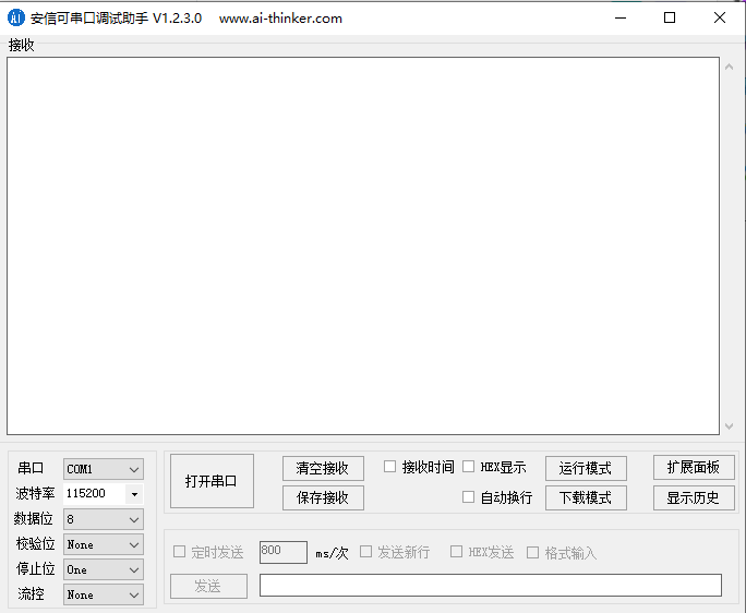 功能特点:支持灵活调节波特率等串口通信参数配置。界面包含接收区、串口通信参数配置区、串口打开关闭与其他设置区域、手动发送区域、多文本发送区、辅助区域等。接收区可显示接收到的数据,支持多种显示设置;可进行手动发送和定时发送,支持十六进制发送。