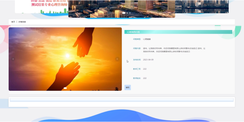 学生点击出调查问卷页面的搜索栏输入标题、问卷类型进行查询,然后可以查看标题、图片、问卷类型、发布时间、教师工号、教师姓名等信息,如果有需要可以进行填写等操作,如图5-4所示: