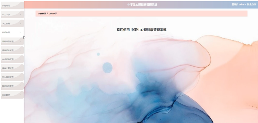 管理员进入系统主页面,主要功能包括对系统首页、个人中心、学生管理、教师管理、问卷类型管理、调查问卷管理、完成问卷管理、健康文章管理、学生留言管理、教师留言管理、系统管理等进行操作。管理员主页面如图5-7所示: