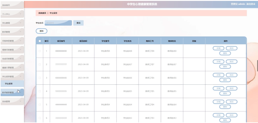 管理员点学生留言管理:在学生留言管理页面,可以对留言编号、留言时间、学生账号、学生姓名、教师工号、教师姓名、回复等信息,进行查询或者删除学生留言等操作,如图5-13所示: