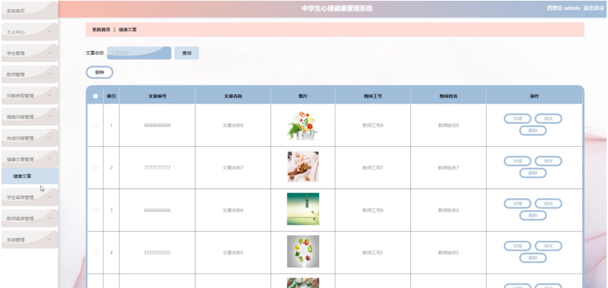 管理员点击健康文章管理:在健康文章管理页面,可以对文章编号、文章名称、图片、教师工号、教师姓名等信息,进行查询或者删除健康文章等操作,如图5-12所示: