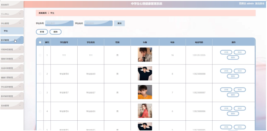 管理员点击学生管理:在学生管理页面,可以对学生账号、学生姓名、性别、头像、年龄、电话号码等信息,进行查询或者新增、删除学生信息等操作,如图5-8所示: