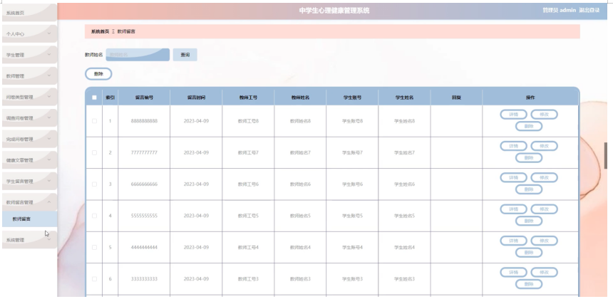 管理员点教师留言管理:在教师留言管理页面,可以对留言编号、留言时间、教师工号、教师姓名、学生账号、学生姓名、回复等信息,进行查询或者删除教师留言等操作,如图5-14所示: