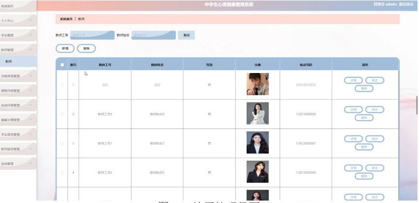 管理员点击教师管理:在教师管理页面,可以对教师工号、教师姓名、性别、头像、电话号码等信息,进行查询或者新增、删除教师信息等操作,如图5-9所示: