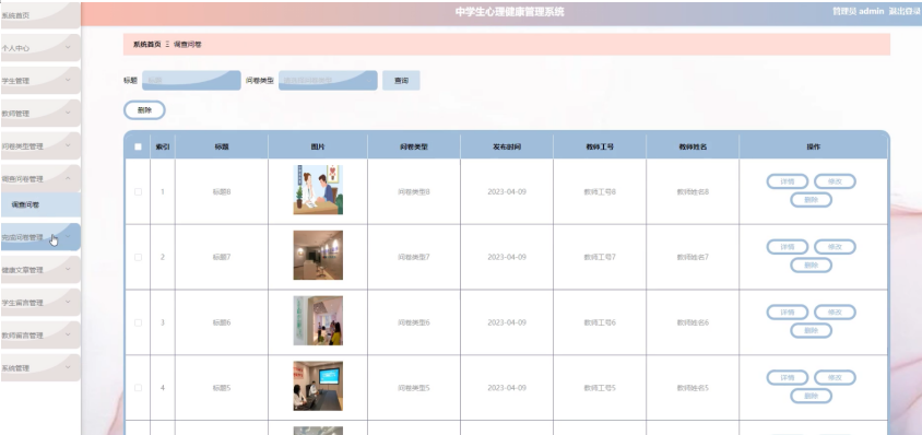 管理员点击调查问卷管理:在调查问卷管理页面,可以对标题、图片、问卷类型、发布时间、教师工号、教师姓名等信息,进行查询或者删除调查问卷等操作,如图5-10所示: