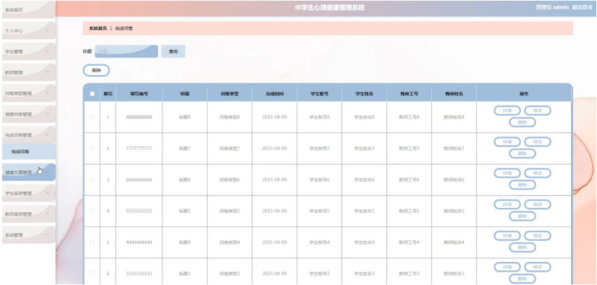 管理员点击完成问卷管理:在完成问卷管理页面,可以对填写编号、标题、问卷类型、完成时间、学生账号、学生姓名、教师工号、教师姓名等信息,进行查询或者删除完成问卷等操作,如图5-11所示: