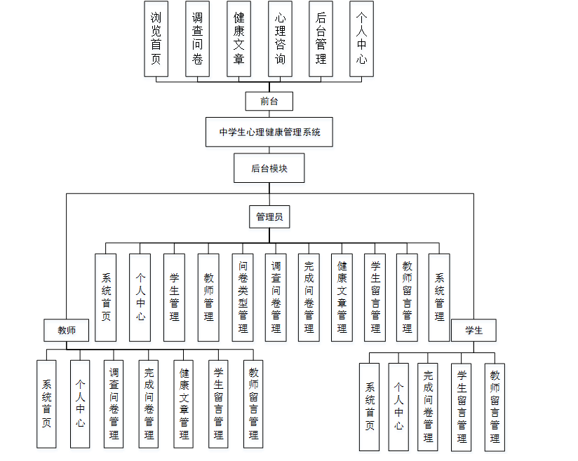 系统功能结构图是系统设计阶段,系统功能结构图只是这个阶段一个基础,整个系统的架构决定了系统的整体模式,是系统的根据。中学生心理健康管理系统的整个设计结构如图4-1所示。