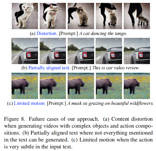 - 物体失真与帧闪烁:当文本描述 “非现实场景”(如 “跳探戈的猫”)时,因训练数据中此类样本少,且 VAE 仅用图像训练,导致视频出现物体变形、帧间闪烁;