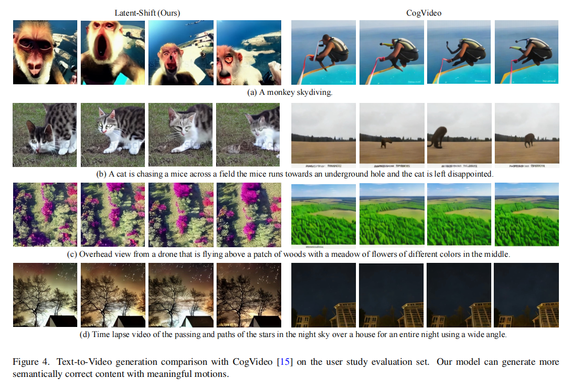- 结合图 4、图 5 的定性对比(如 “猴子跳伞”“猫追老鼠” 等案例),Latent-Shift 能生成更符合文本描述的细节(如 “老鼠钻进地洞”“猫失望离开”),且运动更自然,无明显帧闪烁。