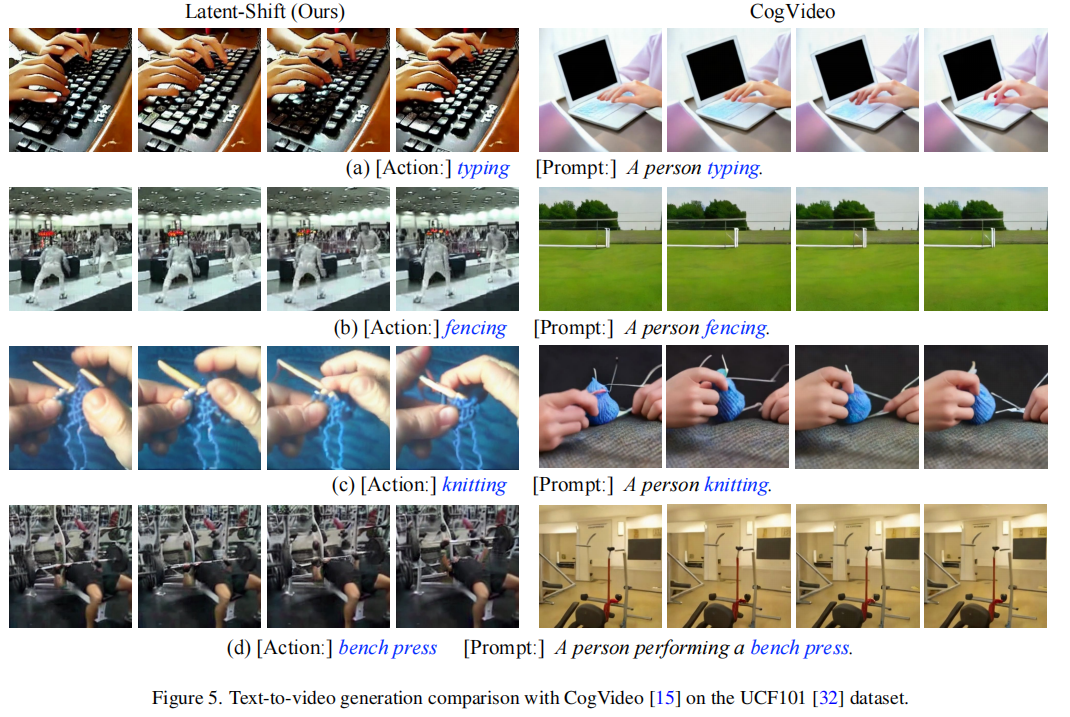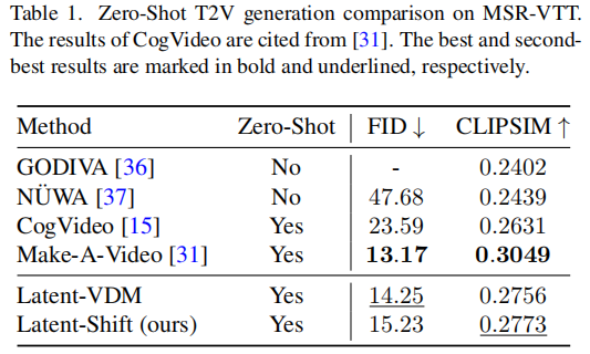 - 基线模型:CogVideo、Make-A-Video、VDM、Latent-VDM(带时间注意力的 Latent 扩散模型,与 Latent-Shift 同训练设置,仅替换时间偏移模块为时间注意力)。