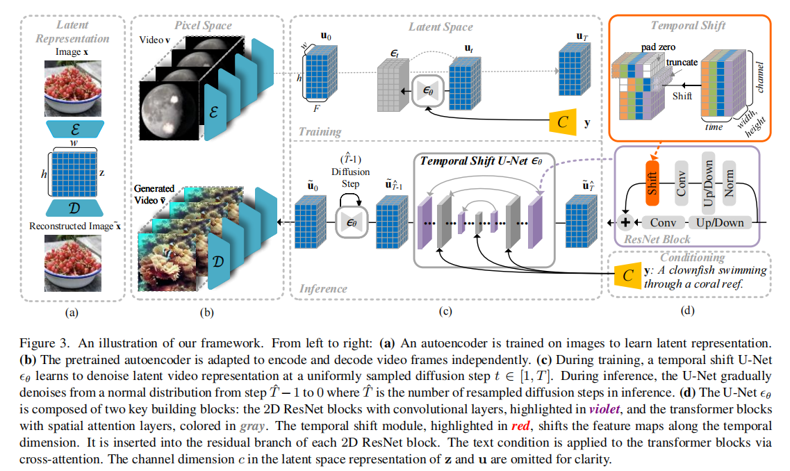 基于上述模块,Latent-Shift 将预训练 T2I 模型适配为 T2V 模型的流程如图 3 所示,分为训练与推理两个阶段: