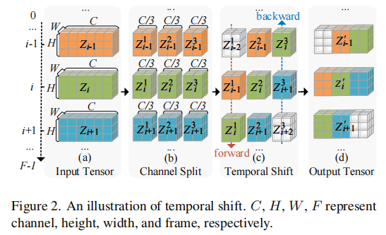 图 2 中,C 为通道数,F 为帧数,H/W 为特征高 / 宽。模块通过通道拆分、时间偏移、合并,实现帧间特征融合。