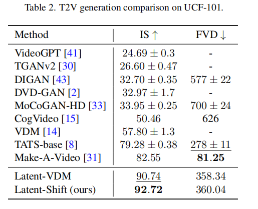 - Latent-Shift 的 IS 值(92.72)为所有模型中最高,说明生成视频的帧级质量最优;