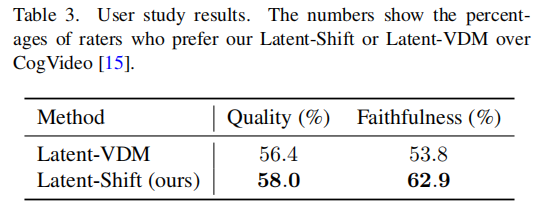 客观指标无法完全反映视频的 “观感” 与 “文本对齐度”,团队通过 AMT 平台对比 Latent-Shift、Latent-VDM 与 CogVideo 的主观表现,结果如表 3 所示(百分比为 “偏好该模型” 的标注员比例):