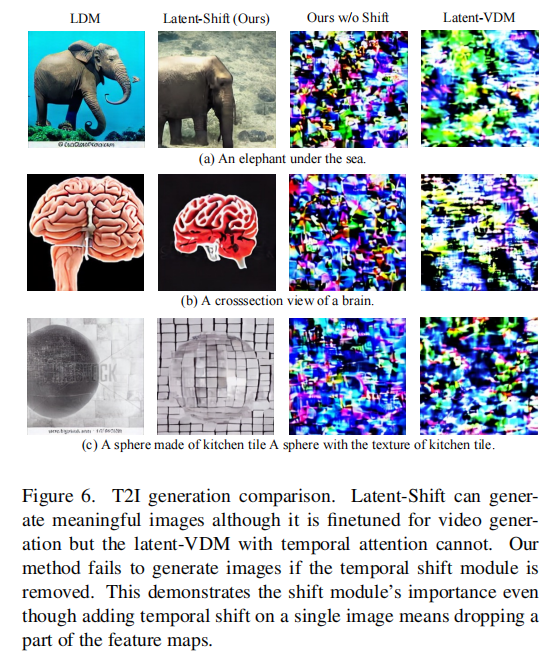 测试 Latent-Shift 在 “有无时间偏移模块” 下的 T2I 生成能力,结果如图 6 所示: