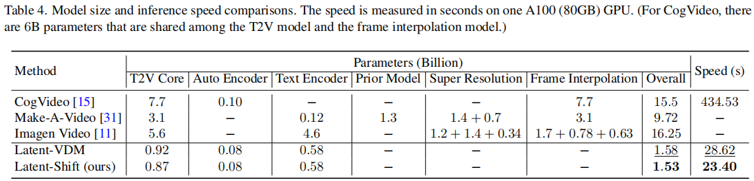 效率是 Latent-Shift 的核心优势,团队在单 A100(80GB)GPU 上测试模型参数规模与推理速度,结果如表 4 所示: