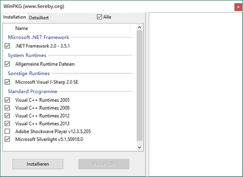 我们也可以根据自己的需求勾选和取消安装某些运行库,还可以用 U 盘给不方便上网的电脑离线安装这些运行库。确定安装哪些运行库之后,点击按钮 Installieren 就可以全部安装了。