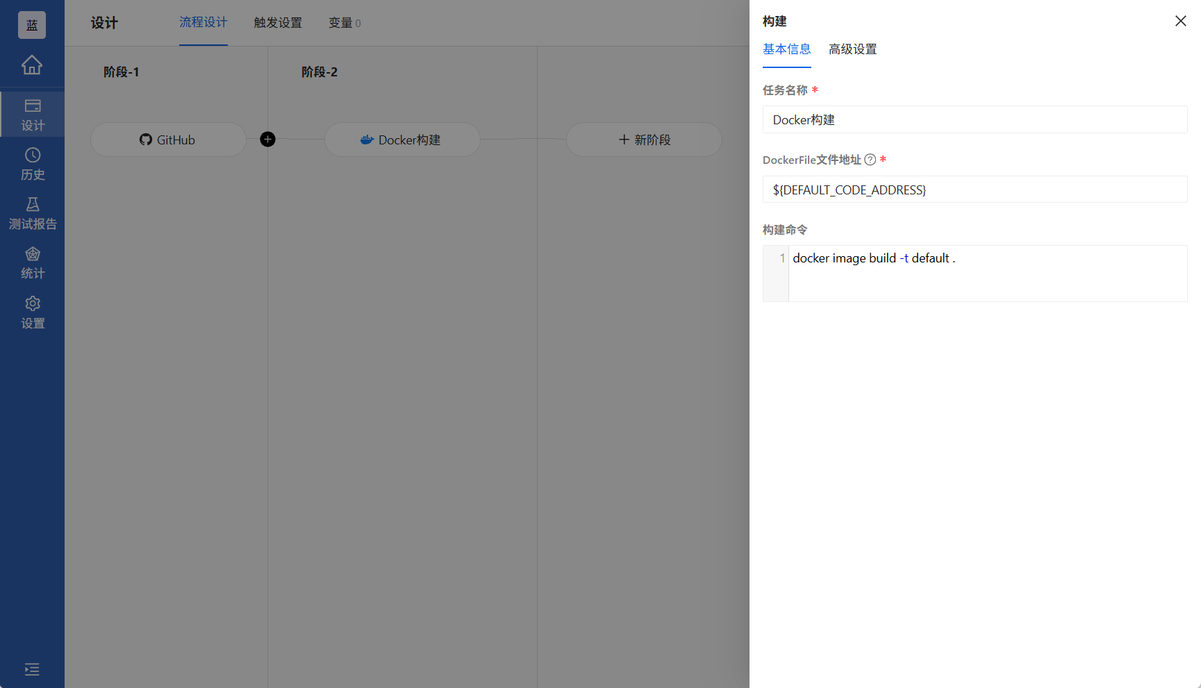 点击新阶段→构建→Docker构建。添加成功之后,弹出Docker构建配置。