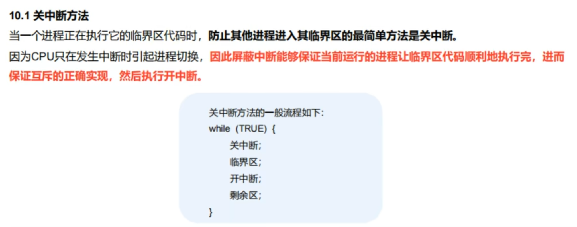老朋友,再熟悉不过了,【关中断】就是一种【原语指令】,屏蔽掉中断而让当前进程一直执行,其他进程再怎么发I/O请求而触发中断,人家都闭门造车听不见,直到【开中断指令】,没啥好说的