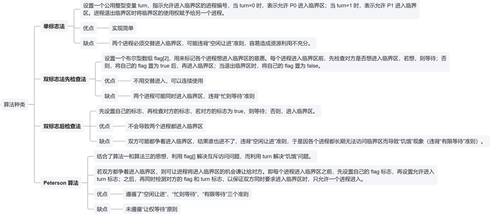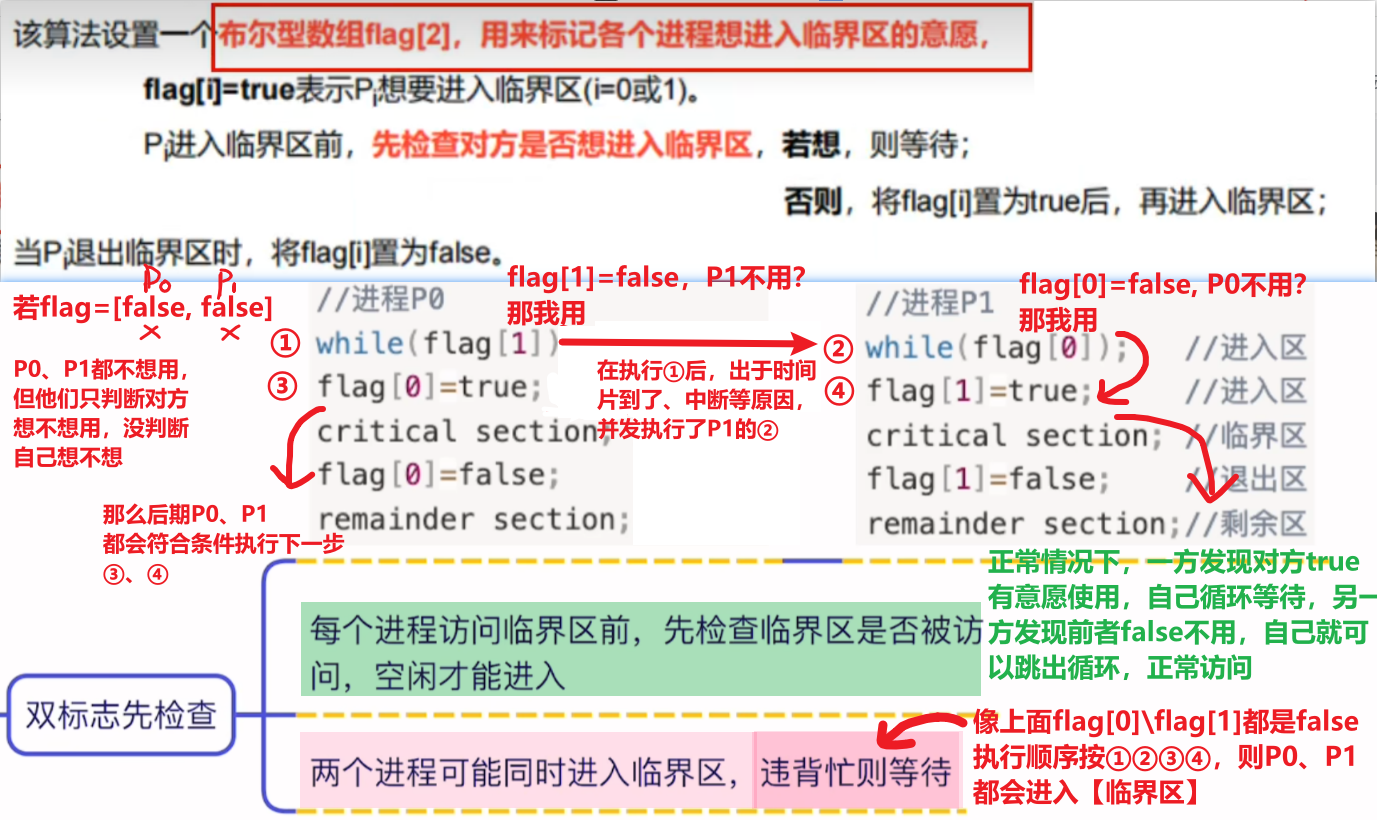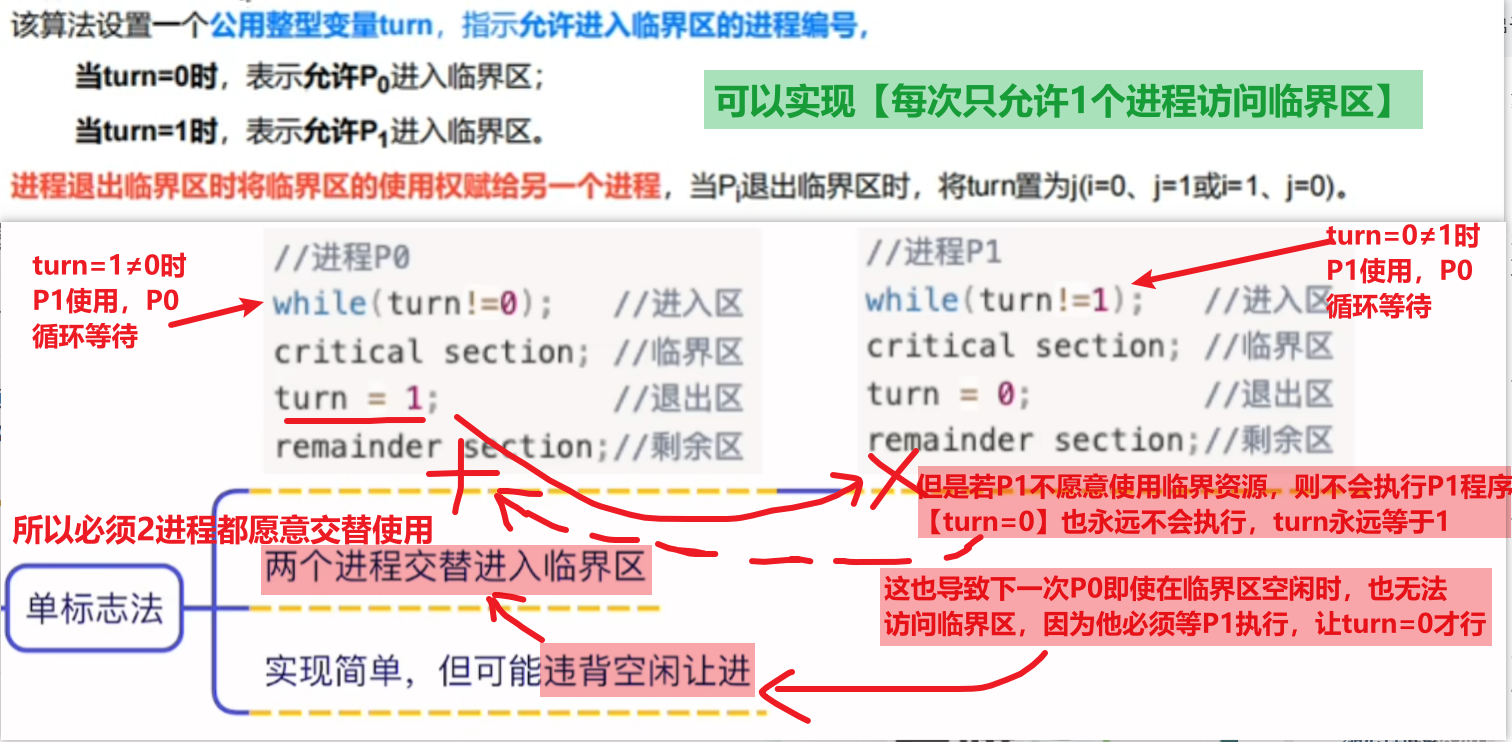 - (因为有while循环,如果你没有资格进入临界区,你只会一直在while循环,也不能修改flag值让出位置给别的进程)