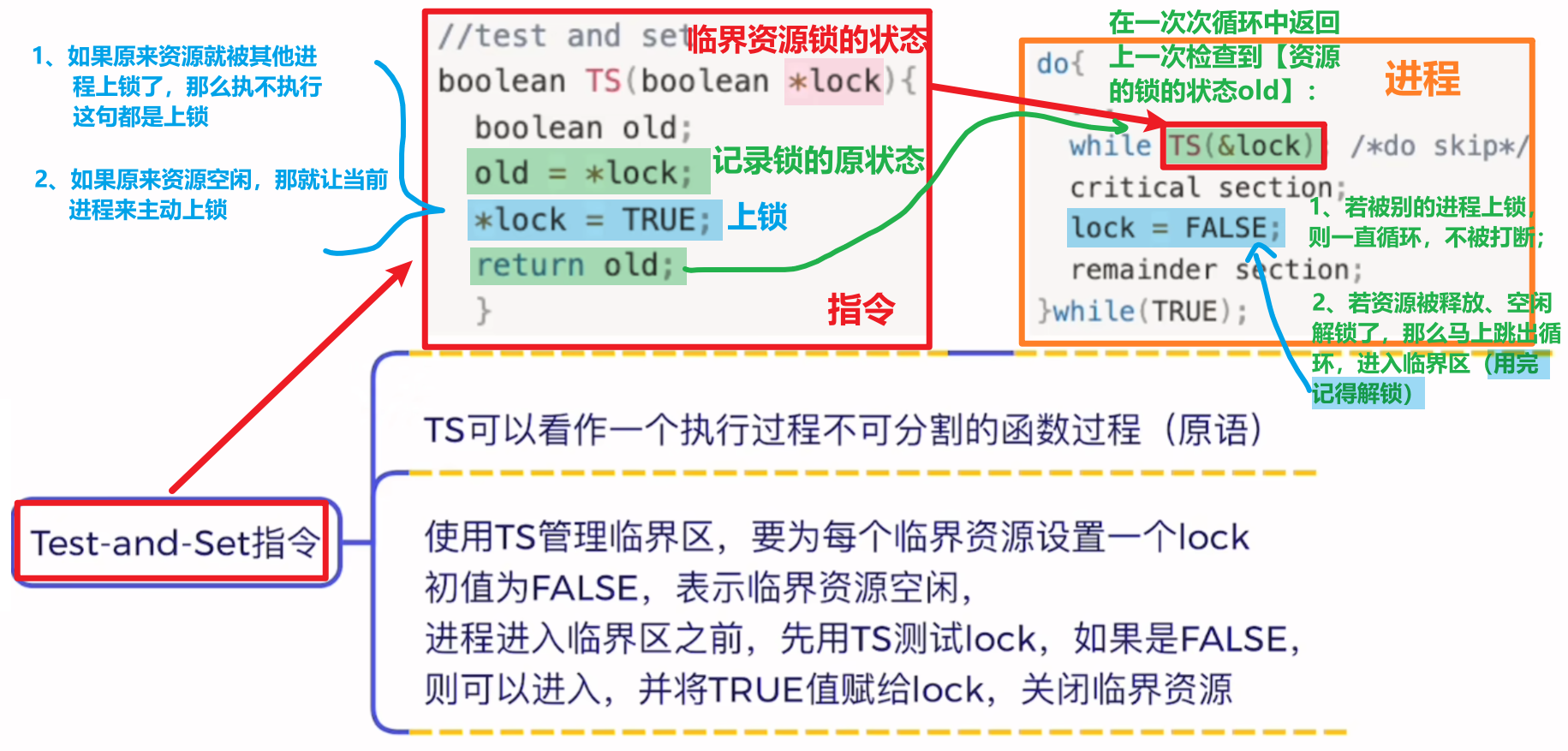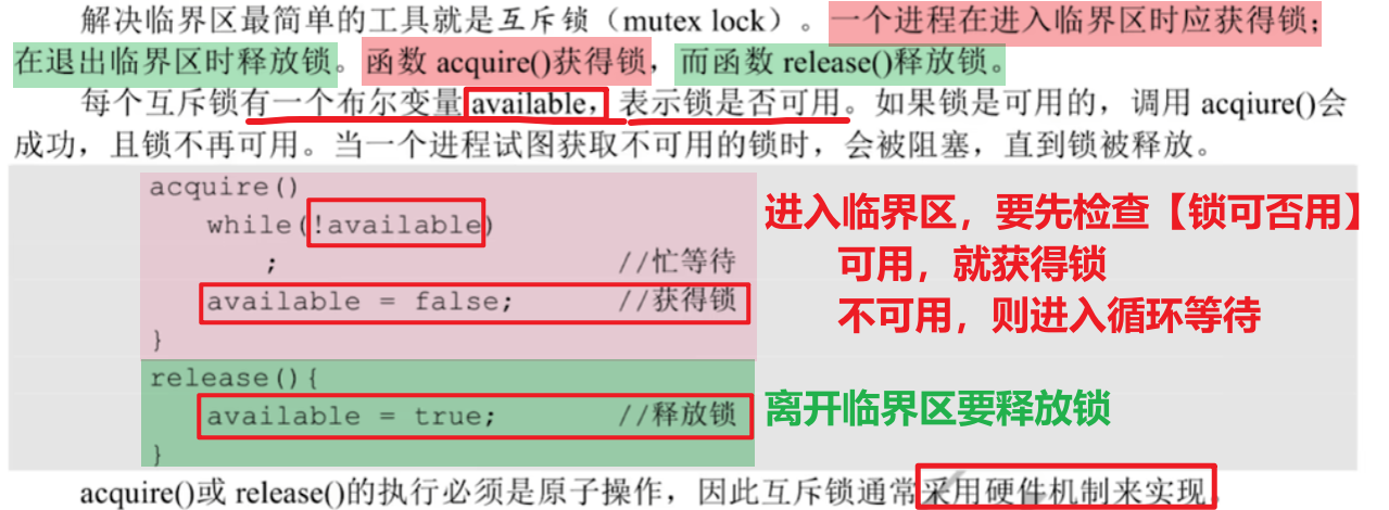 原理就是:只用一句【机器指令】,完成一系列不可中断的原子操作,来实现进程上锁