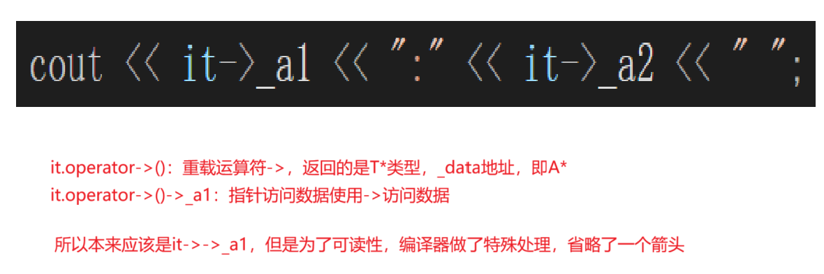 - 运算符重载->:list迭代器模拟的是原生指针行为,当list存储的是int类型数据时,it类似于int * 类型,所以访问int * 数据,直接 * it得到数据,A类型的 it 迭代器的类型是A *,所以访问A类型数据使用->