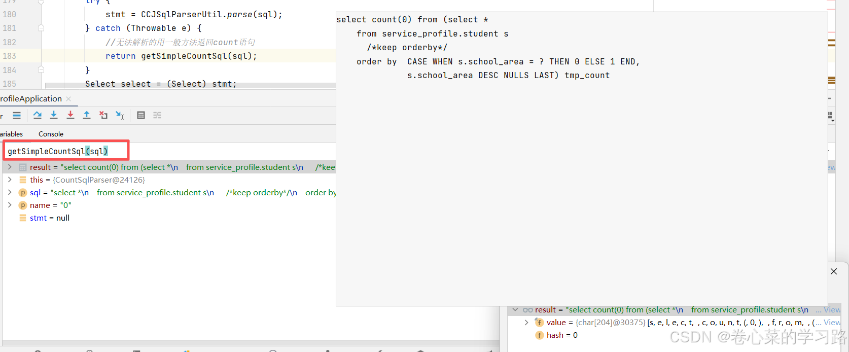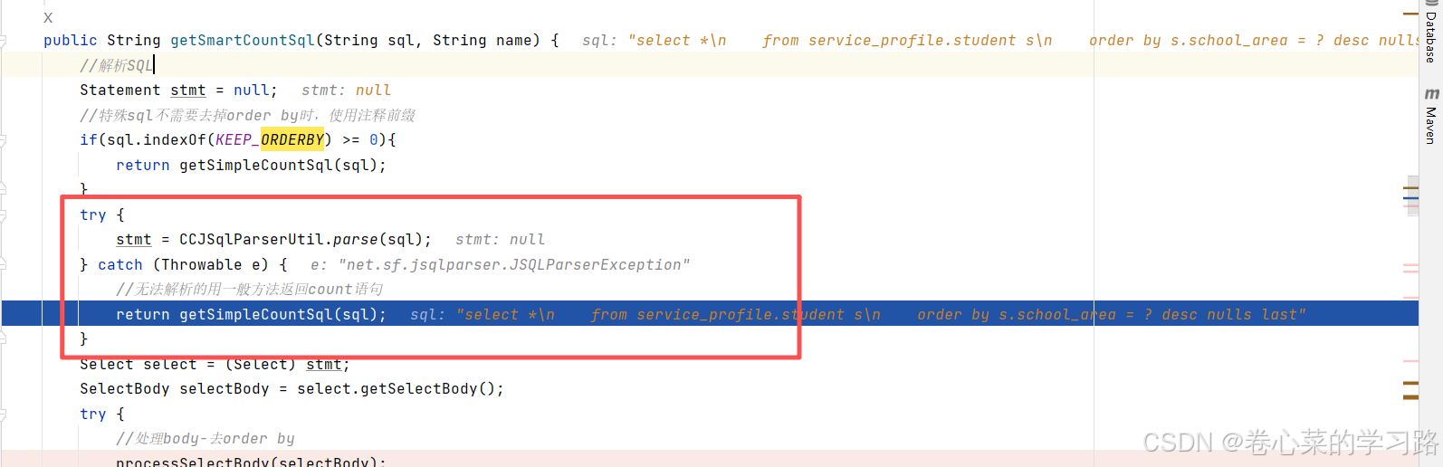 看到这里我就知道了,PageHelper中引入的jsqlparser较低,jsqlparser解析不了该sql报错,然后就直接返回了simpleCountSql