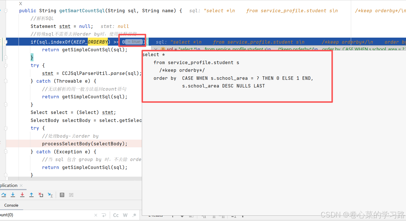 public String getSmartCountSql(String sql, String name) {// 若SQL含/*keep orderby*/,直接生成嵌套COUNT查询if (sql.indexOf("/*keep orderby*/") >= 0) {return getSimpleCountSql(sql, name);}// 其他解析逻辑...
