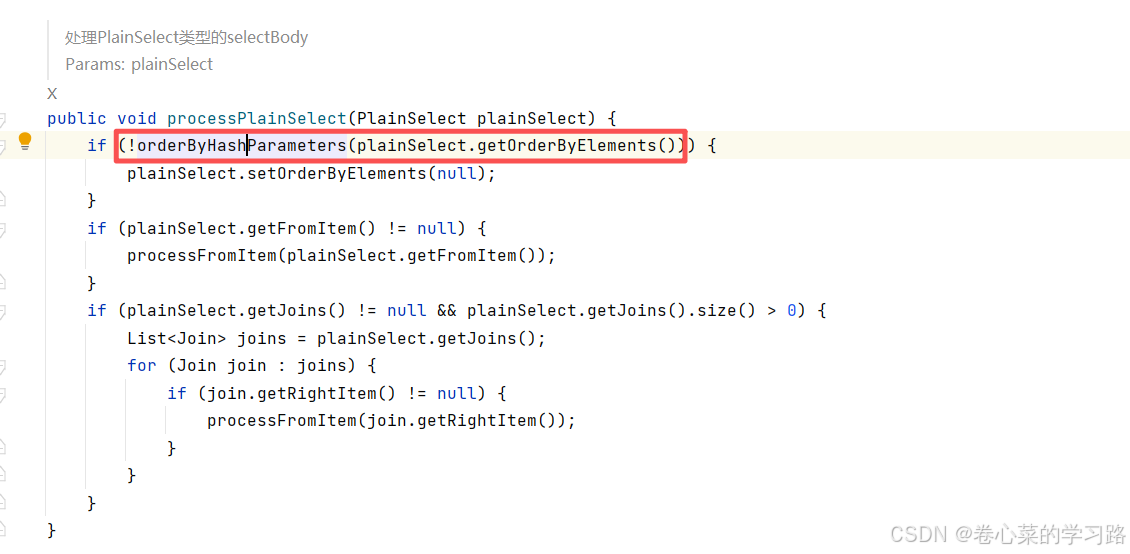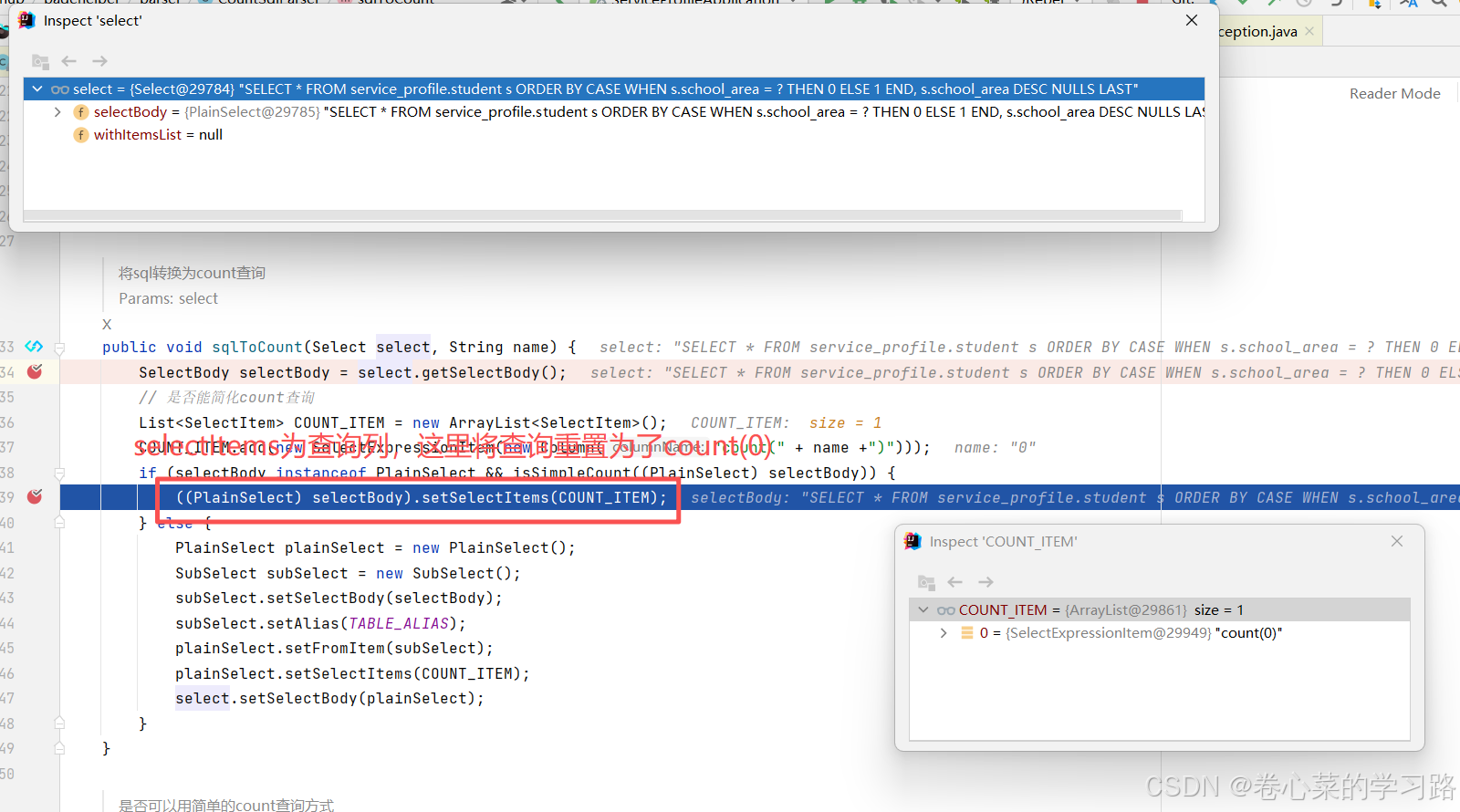 public void sqlToCount(Select select, String name) {SelectBody selectBody = select.getSelectBody();List<SelectItem> COUNT_ITEM = new ArrayList<>();COUNT_ITEM.add(new SelectExpressionItem(new Function("count", new Column(name))));// 若为简单查询,直接替换SELECT列为count(0)if (selectBody instanceof PlainSelect && isSimpleCount((PlainSelect) selectBody)) {((PlainSelect) selectBody).setSelectItems(COUNT_ITEM);} else {// 非简单查询:生成“外层COUNT嵌套原查询”的SQLPlainSelect plainSelect = new PlainSelect();SubSelect subSelect = new SubSelect();subSelect.setSelectBody(selectBody);subSelect.setAlias("tmp_count");plainSelect.setFromItem(subSelect);plainSelect.setSelectItems(COUNT_ITEM);select.setSelectBody(plainSelect);}