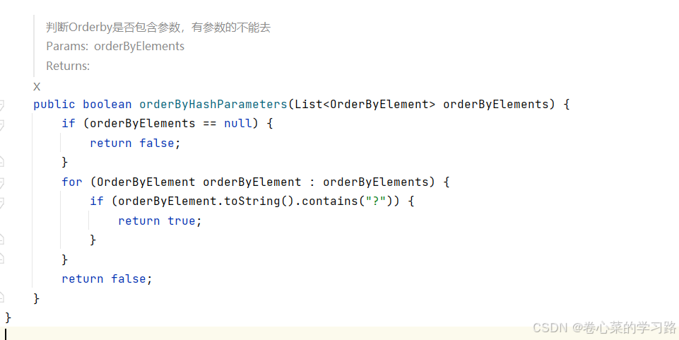 public boolean isSimpleCount(PlainSelect select) {// 1. 含GROUP BY → 非简单查询if (select.getGroupByColumnReferences() != null) {return false;}// 2. 含DISTINCT → 非简单查询if (select.getDistinct() != null) {return false;}// 3. SELECT列含占位符 → 非简单查询for (SelectItem item : select.getSelectItems()) {if (item.toString().contains("?")) {return false;}// 4. SELECT列含聚合函数(非允许列表)→ 非简单查询if (item instanceof SelectExpressionItem) {Expression expression = ((SelectExpressionItem) item).getExpression();if (expression instanceof Function) {// 聚合函数(如SUM、AVG)判断逻辑...}}}return true;
