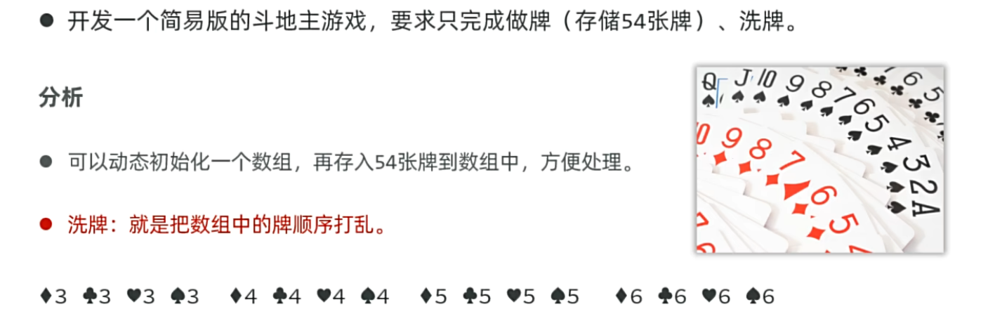 public class test {//数组的遍历public static void main(String[] args) {start();}//做牌:创建一个动态初始化数组存储54张牌public static void start(){String[] arr = new String[54];//存储花色String[] colors = {"♠","♥","♣","♦"};//存储牌String[] numbers = {"A","2","3","4","5","6","7","8","9","10","J","Q","K"};int index = 0;for(int i = 0;i < numbers.length;i++){for(int j = 0;j < colors.length;j++){arr[index++] = colors[j]+numbers[i];}}arr[index++] = "小王";arr[index] = "大王";//打印♠A ♥A ♣A ♦A ♠2 ♥2 ♣2 ♦2 ♠3 ♥3 ♣3 ♦3....for(int i = 0;i < arr.length;i++){System.out.print(arr[i] + "\t");}System.out.println();//把牌洗牌// 随机打乱数组元素顺序// 通过遍历数组,为每个位置随机选择另一个位置进行元素交换for(int i = 0;i < arr.length;i++){// 生成一个随机索引j,范围在[0, arr.length-1]int j = (int)(Math.random()*arr.length);//Math.random()生成随机数,范围在[0, 1)// 交换arr[i]和arr[j]两个位置的元素String temp = arr[i];arr[i] = arr[j];arr[j] = temp;}//打印洗牌后的牌for (int i = 0; i < arr.length; i++) {System.out.print(arr[i] + '\t');}System.out.println();}