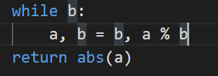 我们来看主要的代码:while b:意思就是只要B不是0,就执行循环内的代码。a,b = b,a%b这是一个并行赋值的式子,其实就等价于temp = a % b a = b b = temp