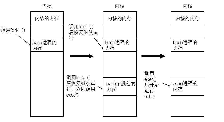 再打算新建一个别的进程时,通常采用称为fork and exec的方式,既有父进程调用fork()创建子进程,再由子进程调用exec(),下图所示为bash进程创建echo进程的流程