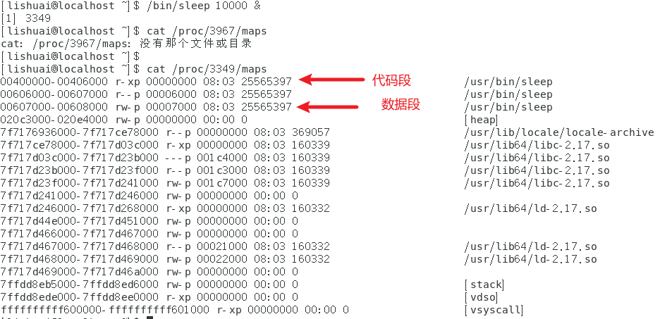 在程序运行时创建的进程的内存映像信息,可以从/proc/pid/maps这一文件中找到,sleep命令的相关信息如下